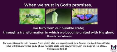 I’m grateful you’re here. This ministry exists to offer encouragement, motivation, and hope through the truth of God’s Word—because His promises are steady, even when life feels uncertain. Over time, I’ve learned that when we slow down to read and study Scripture and truly receive it in our hearts, we draw closer to the Lord—and that closeness grows into trust. When we trust in God's promises, we turn from our humble state; through a transformation in which we become united with His glory. And finally, we are more free to grow into the person whom God created us to be.